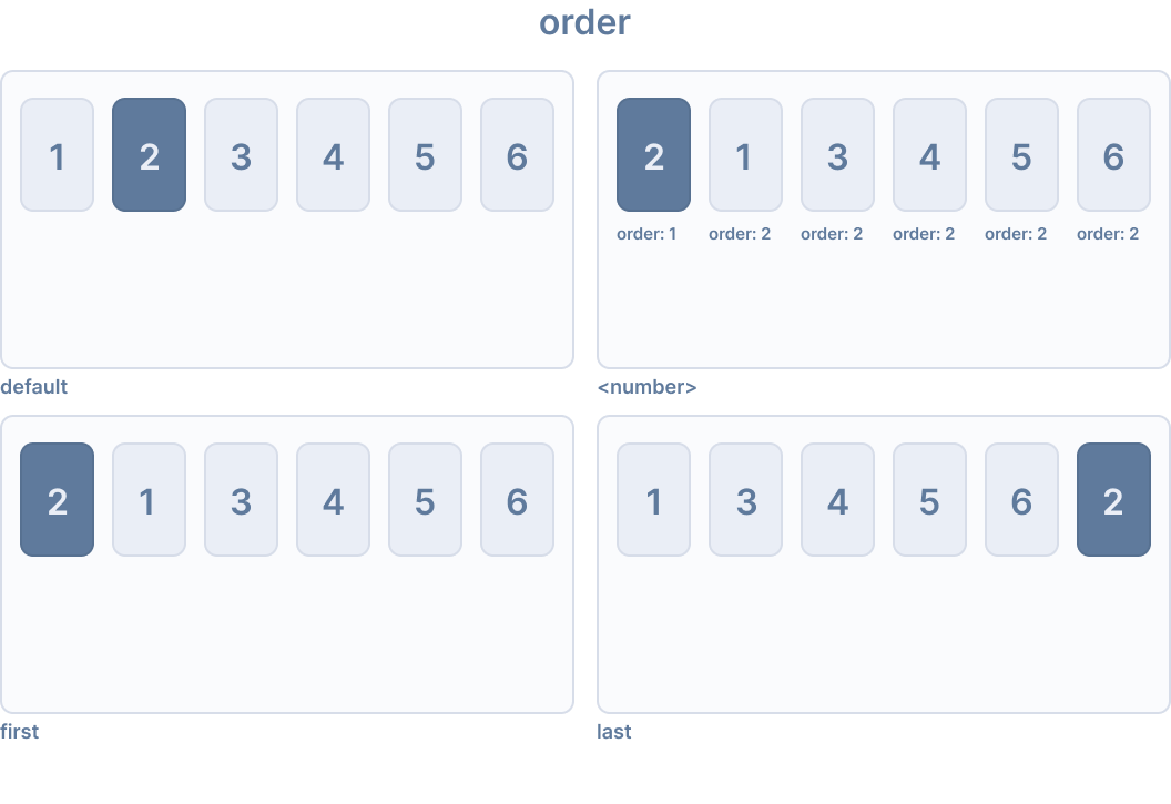 order CSS プロパティは、flex またはグリッドコンテナ内でアイテムをレイアウトする順序を設定します。コンテナ内のアイテムは、昇順のorder値で並べ替えられ、次にソースコードの順序で並べ替え られます。明示的なorder値が指定されていないアイテムには、デフォルト値0が割り当てられます。